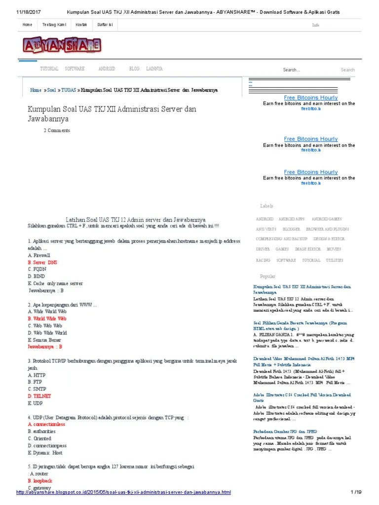 Soal ulangan harian sistem komputer kelas x tkj 1415.doc. Soal hots administrasi infrastruktur jaringan by ridho6andi6pratama. Soal dan jawaban pilihan ganda keamanan jaringan xii tkj. Teknologi layanan jaringan kompotensi keahlian teknik komputer. Jelaskan pengertian vlan pada jaringan !